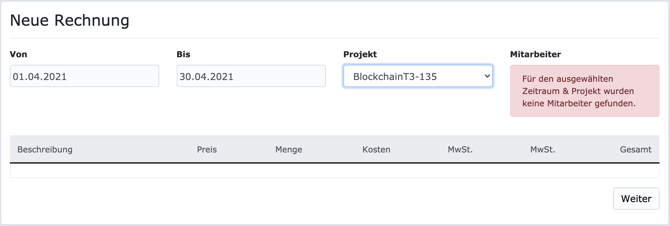 Im ersten Schritt kann man den Zeitraum für die Rechnungserstellung auswählen, sowie das Projekt und den Experten den man abrechnen möchte. Der Zeitraum ist automatisch vor belegt auf den letzten Monat. Beim Projekt ist das erste Projekt in alphabetischer Ordnung vor belegt. Beim Mitarbeiter Drop-Down erscheinen nur Mitarbeiter welche in dem ausgewählten Zeitraum und für das ausgewählte Projekt, auch tatsächliche Zeiten oder Spesen erfasst haben. In dem Beispiel oben erscheint ein roter Warnhinweis weil es für das Projekt in dem ausgewählten Zeitraum keine Spesen und Zeiten gibt. Somit gibt es auch keinen Mitarbeiter den man auswählen könnte.