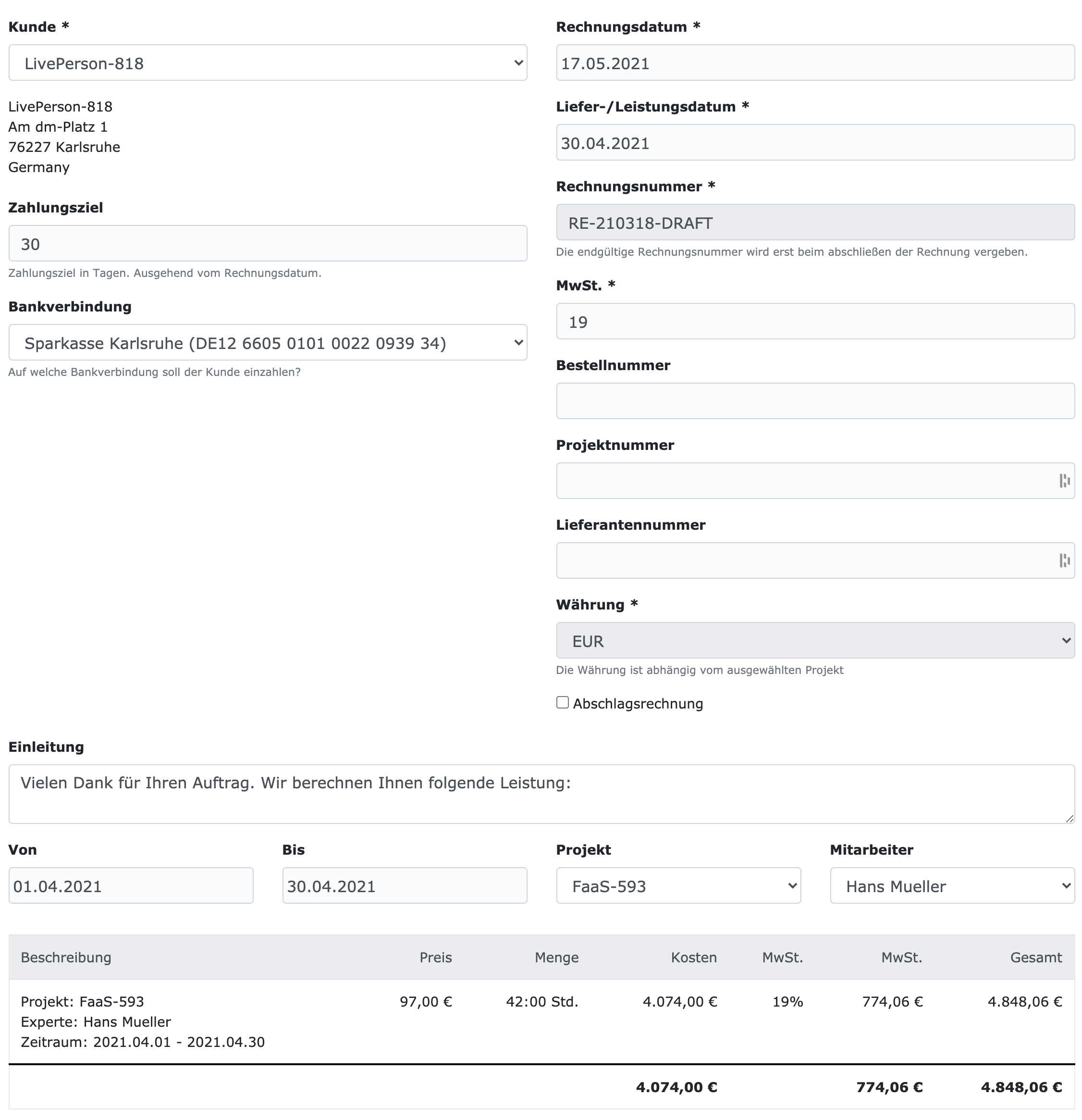 Wenn man auf "Weiter" klickt dann kommt man in das reguläre Rechnungsformular. Allerdings ist dieses dann schon vor belegt mit den Werten aus dem ersten Schritt.