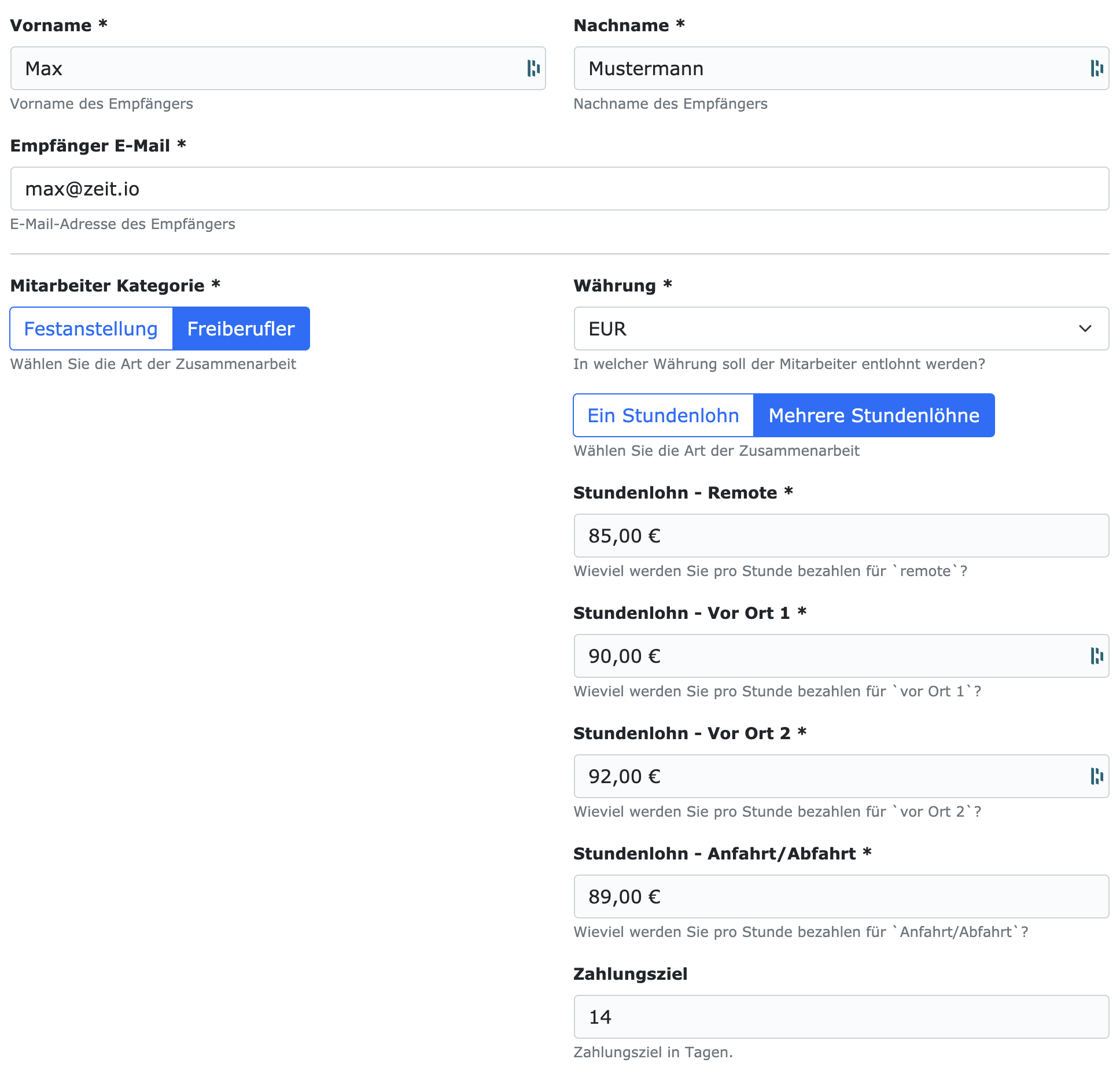 Neuen Freiberufler-Vertrag aufsetzen auf ZEIT.IONach dem Sie den Empfänger angegeben habe können Sie auf die Schaltfläche "Mehrere Stundenlöhne" klicken. Daraufhin erweitert sich das Formular und es erscheinen Eingabefelder für vier verschiedene Stundenlöhne. Hier können Sie festlegen welchen Stundenlohn sie dem Freiberufler zahlen möchten für: