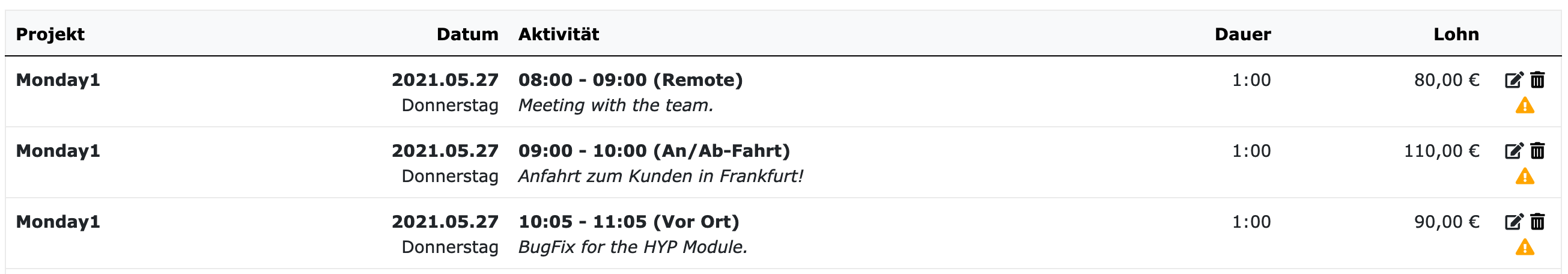 Bei der Tabelle für die Zeiterfassung erscheint jetzt hinter der Uhrzeit in Klammern, die Stundenlohn-Kategorie. Für den Freiberufler sieht das dann wie folgt aus: