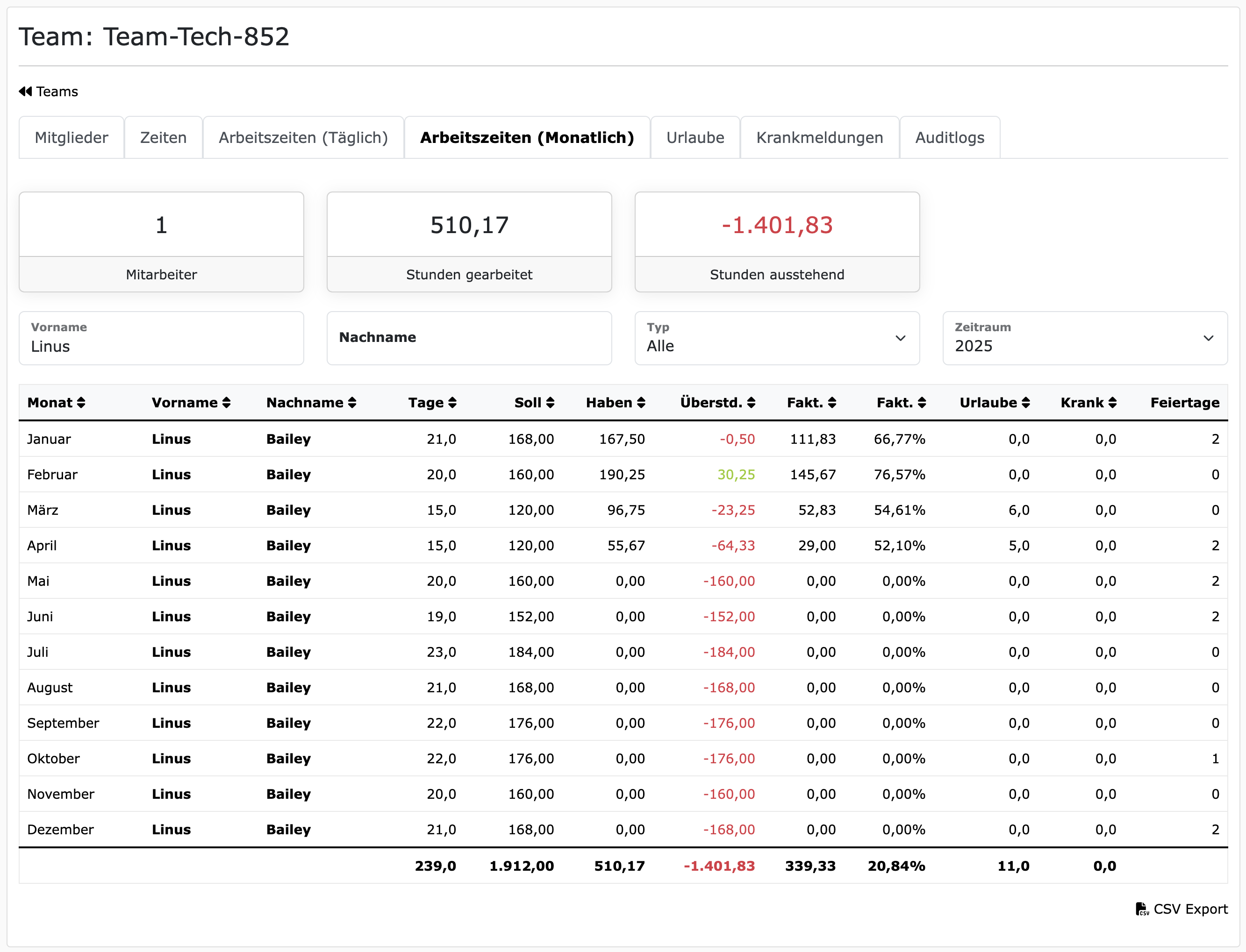 Bei dem Beispiel oben ist zu sehen, dass die jährliche Sollarbeitszeit vom ausgewählten Mitarbeiter 1912 Stunden beträgt für das Jahr 2025. Diese jährliche Sollarbeitszeit berücksichtigt alle Feiertage, Krankmeldungen und genehmigte Urlaube. Für die bessere Planung ist daher sinnvoll, wenn Mitarbeiter ihre jährlich zur Verfügung stehenden Urlaube möglichst früh einreichen. Außerdem ist in dem Screenshot oben zu sehen, dass der Mitarbeiter bereits 510,17 Stunden gearbeitet hat im aktuellen Jahr und dass noch 1401,83 Stunden ausstehen für das geplante Soll.