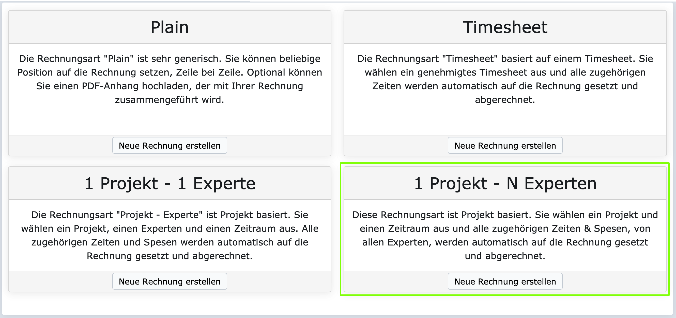ZEIT.IO ist eine Plattform für Zeiterfassung und Rechnungserstellung. Auf ZEIT.IO kann man ein Projekt mit einem Budget anlegen und beliebig viele Mitarbeiter hinzufügen die auf das Projekt Zeiten & Spesen buchen können. Die gebuchten Zeiten und Spesen können jederzeit abgerechnet werden. Hierfür gibt es verschieden Rechnungsvorlagen. Die meisten Benutzer verwenden die "1 Projekt - 1 Experte" Vorlage. Damit ist es möglich einen Experten im Projekt in einem bestimmten Zeitraum abzurechnen. Wenn man aber nun 10 Experten beim Kunden hat die alle auf das gleiche Projekt buchen dann ist es etwas umständlich weil man so 10 verschiedene Rechnungen erstellen müsste. Deshalb gibt es jetzt ein neues Rechnungs-Template, welches hier grün markiert ist im Screenshot unten:
