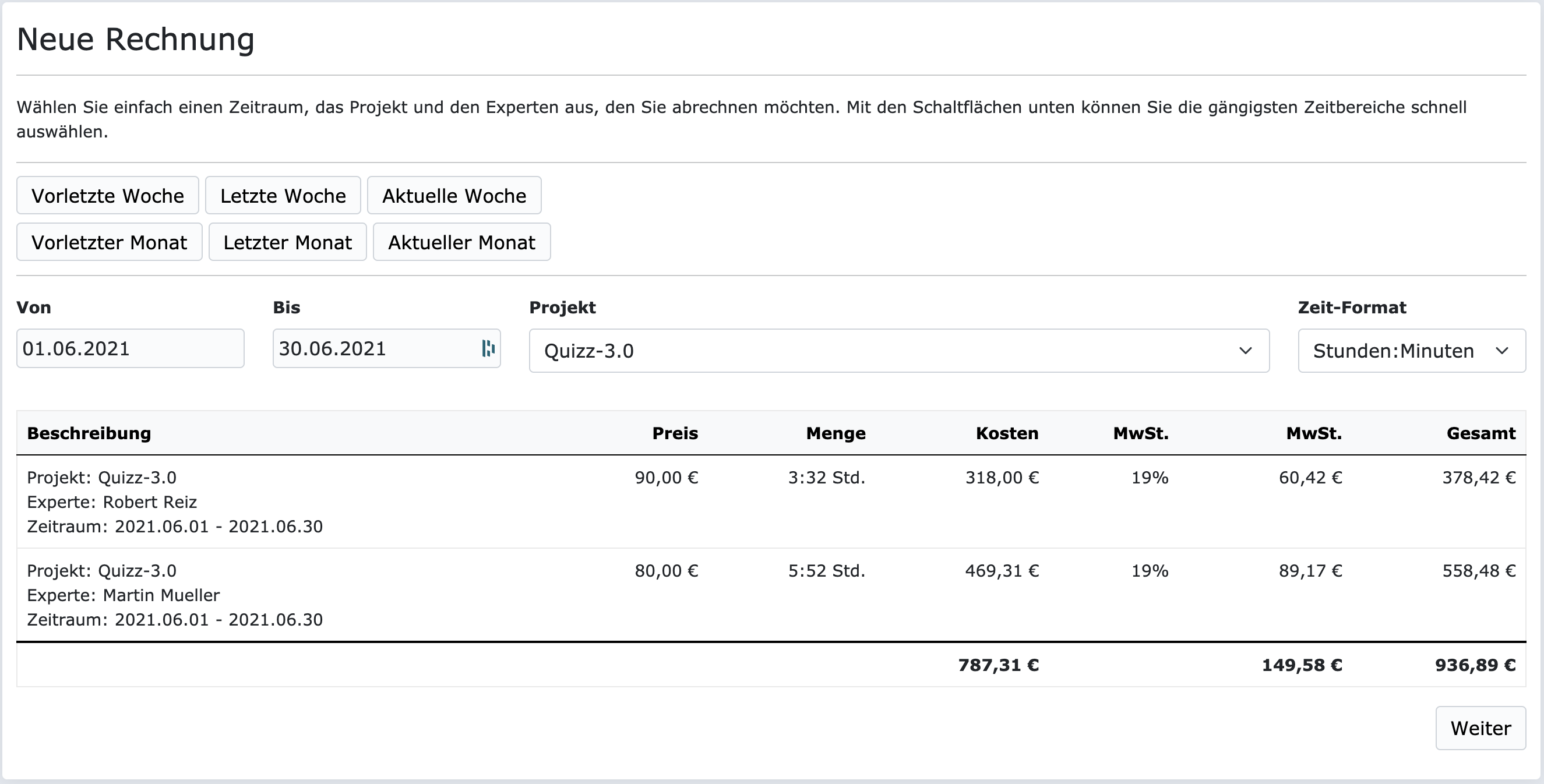 Alle Experten die in dem ausgewählten Zeitraum, Zeiten auf das Projekt gebucht haben, werden automatisch auf die Rechnung gesetzt. Natürlich mit dem jeweiligen Verrechnungssatz der pro Experte im Projekt hinterlegt ist. Somit kann man mit wenigen Mausklicks eine Rechnung generiere welches N Experten im Projekt abrechnet.