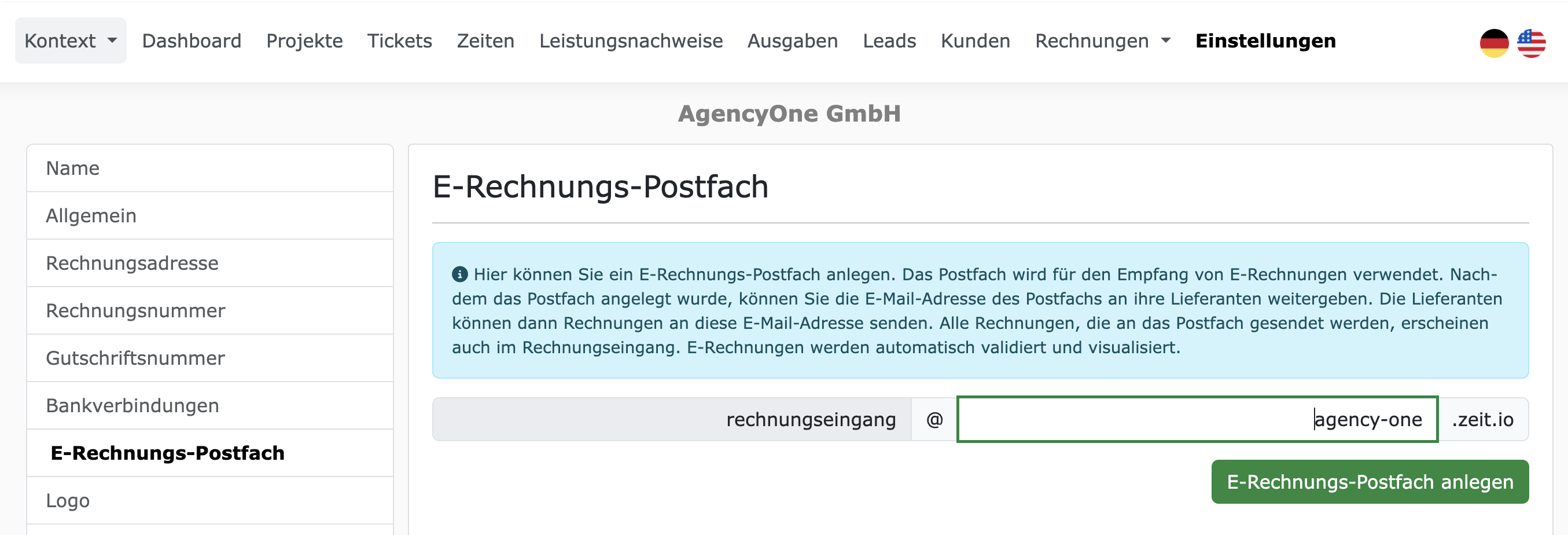 E-Rechnungs-Postfach anlegenSie können sich für die Adresse eine Subdomain von ZEIT.IO aussuchen. Idealerweise sollte das Ihr Firmenname sein. Wenn Sie auf den Button "E-Rechnungs-Postfach anlegen" klicken dann wird das Postfach sofort angelegt und ist auch sofort einsatzbereit!
