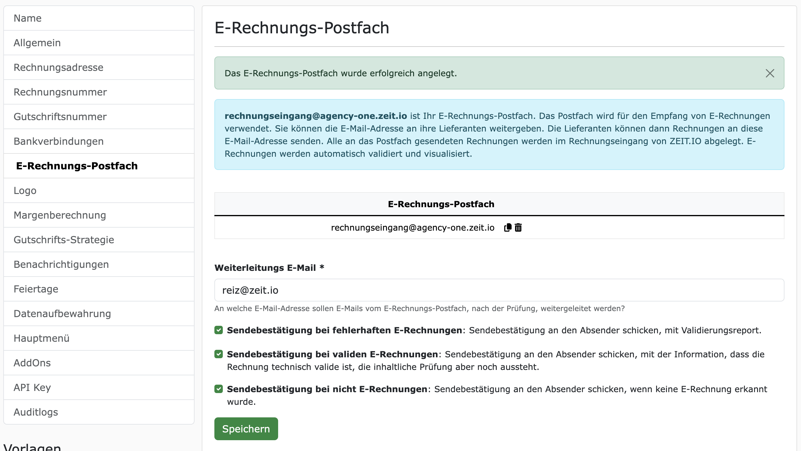 Das E-Rechnungs-Postfach kann in den Einstellungen angelegt und konfiguriert werden. Bei einer ZEIT.IO Organisation navigieren Sie dazu im Hauptmenü auf den Punkt "Einstellungen" und dann auf "E-Rechnungs-Postfach". Das Formular dazu sieht so aus: