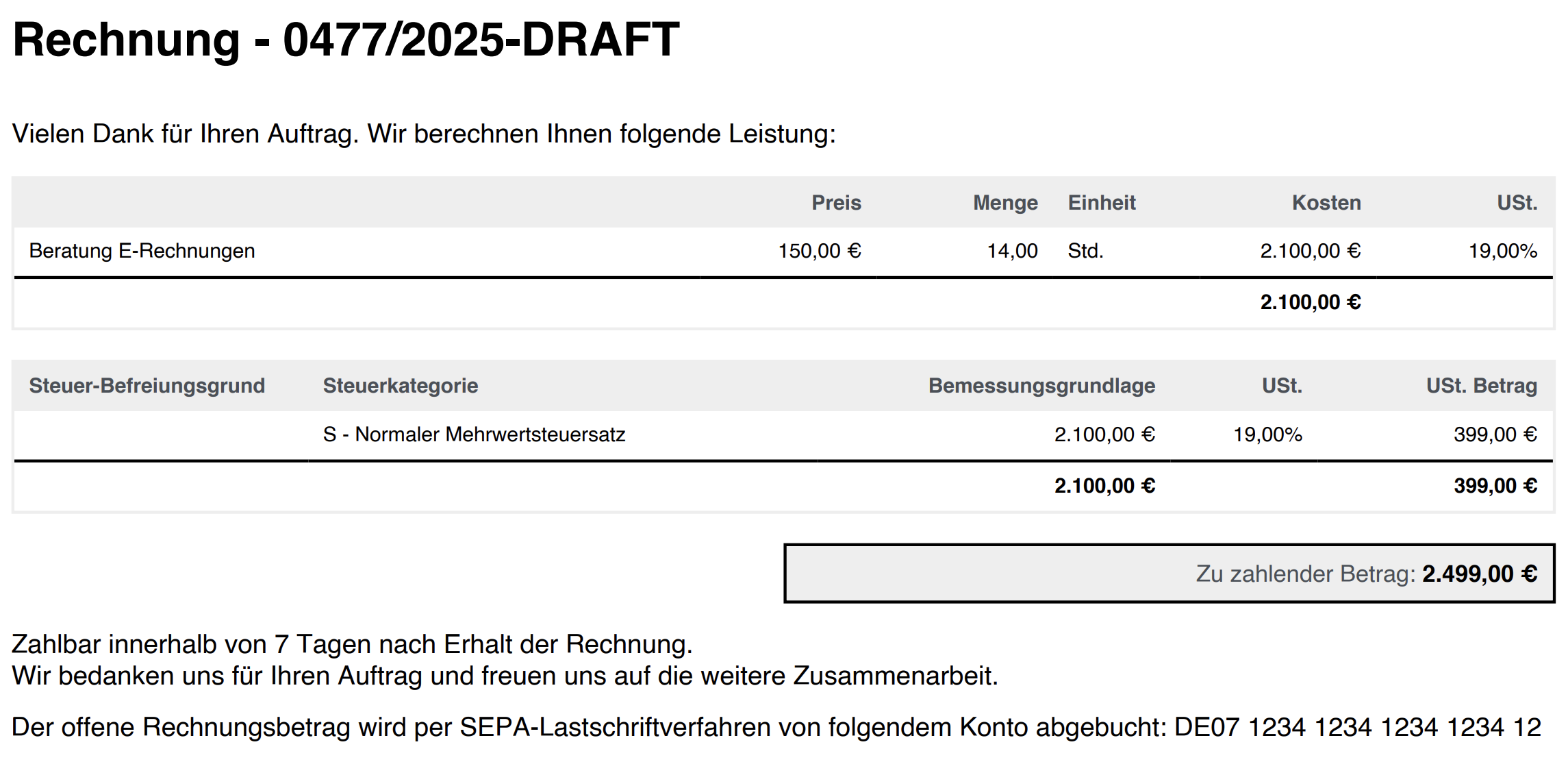 ZUGFeRD Rechnung mit Zahlungsmethode 49 - SEPA Lastschriftverfahren