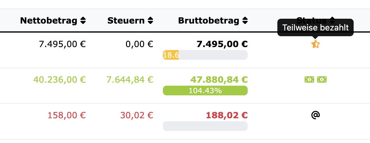 Wenn eine Rechnung nur teilweise bezahlt wurde, dann wird in der Status-Spalte ein halber Stern eingeblendet. Wenn eine Rechnung überbezahlt wurde, dann werden zwei Geldschein-Icons eingeblendet. Damit sieht man in der Übersicht sehr schnell wo es Teilzahlungen über Überzahlungen gibt.
