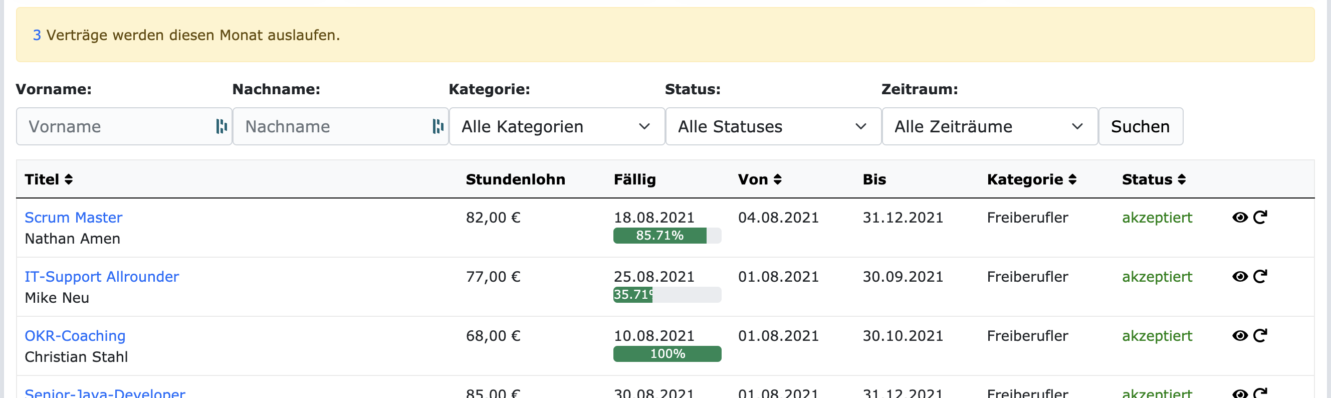 Verträge einer Organisation auf ZEIT.IOIn dem Beispiel oben wird angezeigt das diesen Monat 3 Verträge auslaufen werden. Die Zahl in der Nachricht ist natürlich anklickbar. Beim Klick auf die Zahl werden die Verträge angezeigt die diesen Monat auslaufen werden. Hier ein Beispiel: