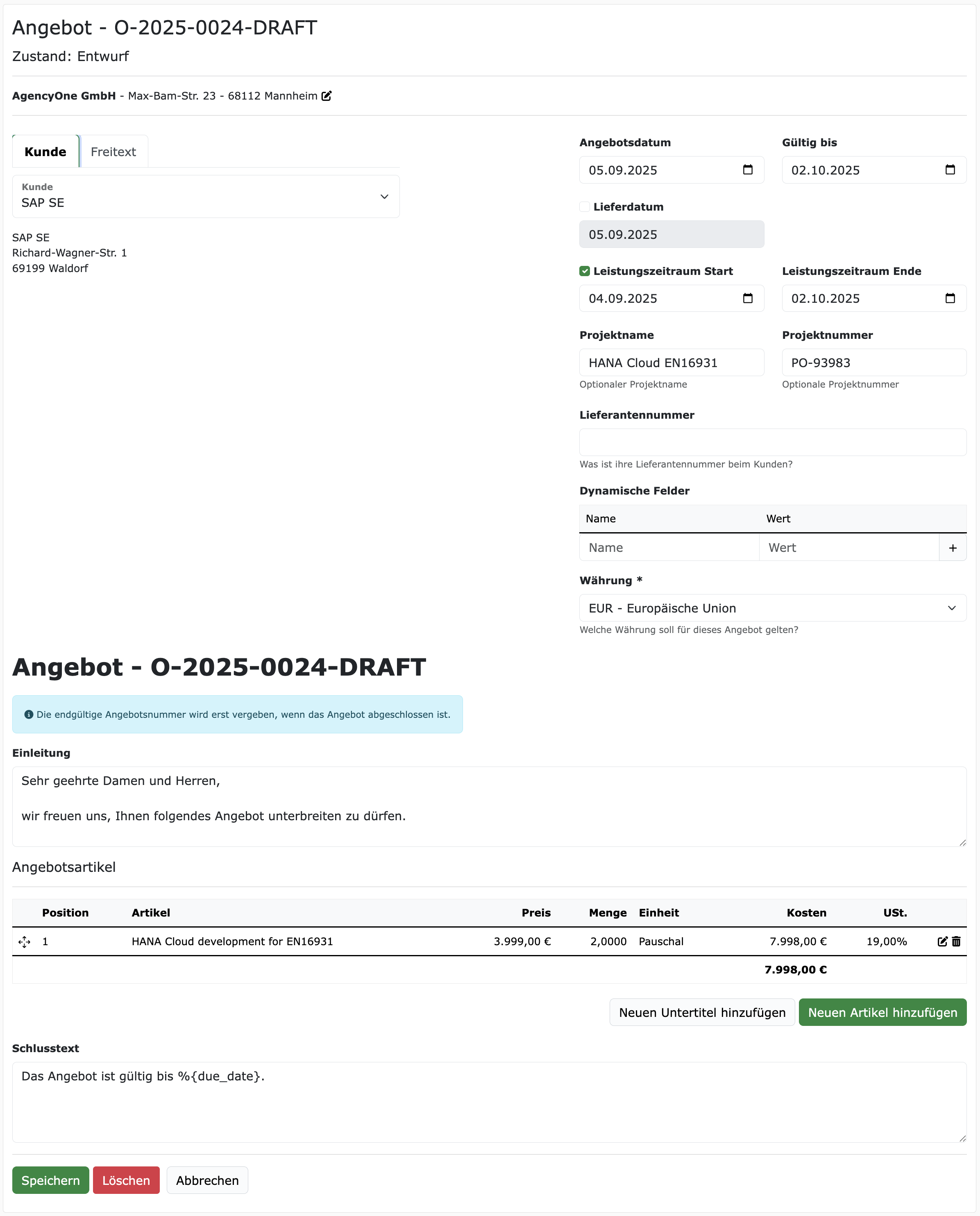 Genau wie bei den Ausgangsrechnungen, können optional auch dynamische Felder hinzugefügt werden. Diese erscheinen auf dem Angebot dann in der rechten oberen Ecke.