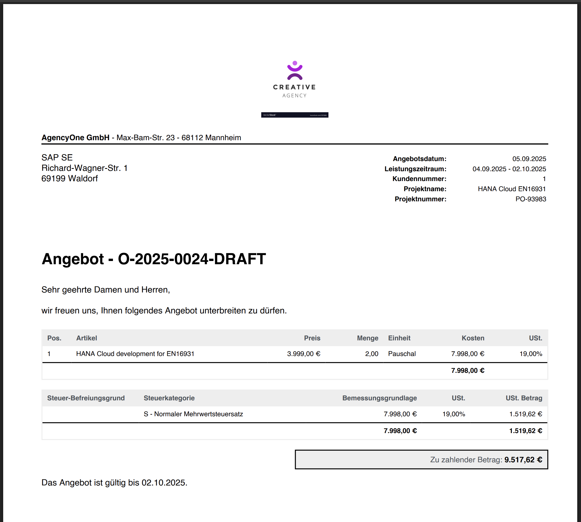 Beispiel-Angebot auf ZEIT.IODie finale Angebotsnummer wird erst vergeben, wenn das Angebot abgeschlossen ist. Äquivalent zu Ausgangsrechnungen.