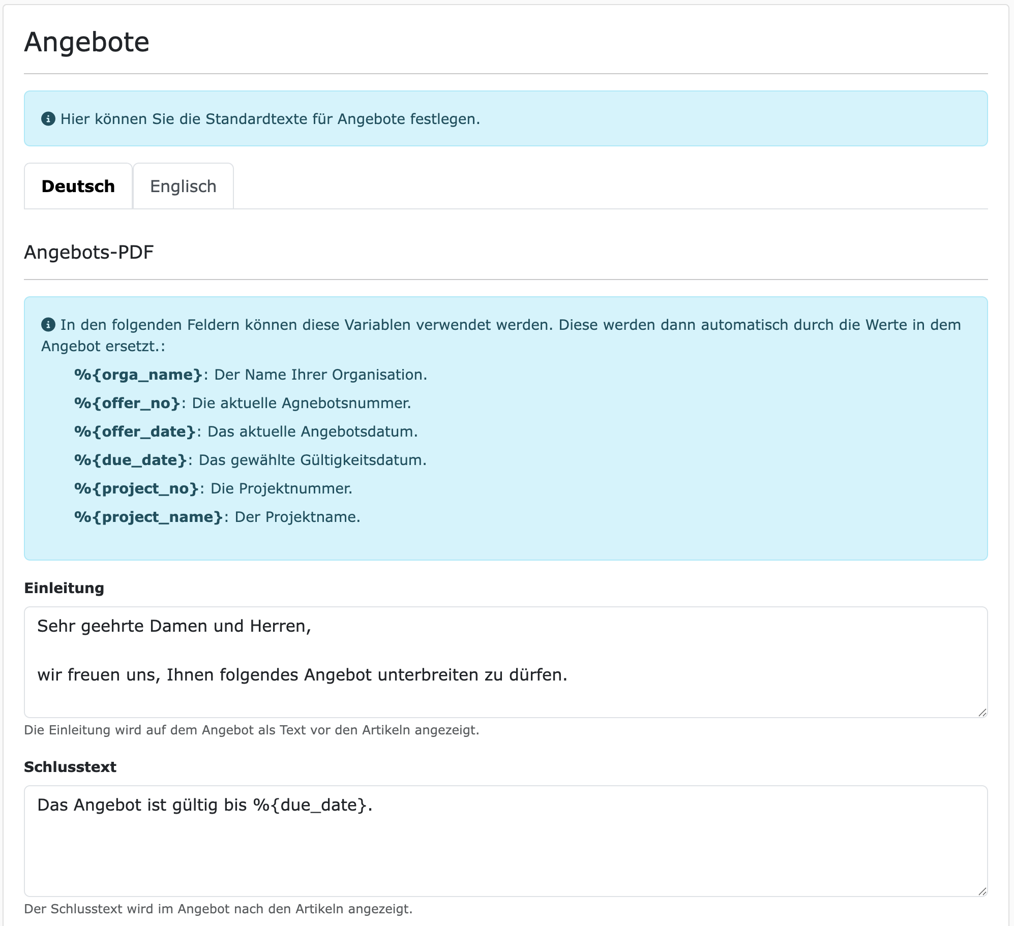 Ja selbstverständlich! Ähnlich wie bei Ausgangsrechnungen, können die Standard-Texte für Angebot und E-Mail-Versand frei konfiguriert werden. Unter dem Hauptmenüpunkt "Einstellungen -> Vorlagen -> Angebote" können die Standardtexte konfiguriert werden. Hierbei kann man auch bestimmte Variablen verwenden, um die Texte auf das jeweilige Angebot anzupassen.