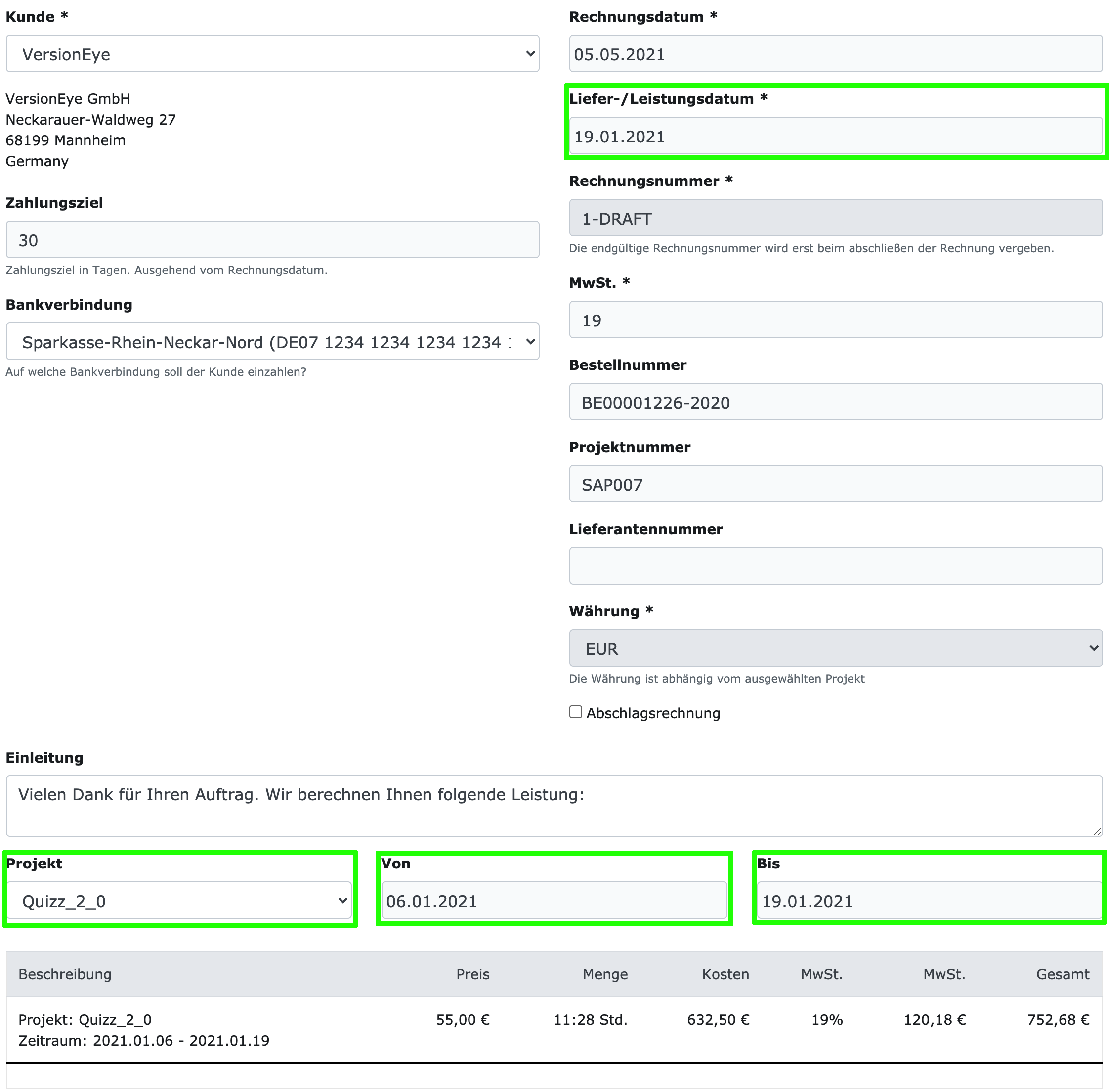 Wenn man da drauf klickt, gelangt man direkt zur Rechnungserstellung. Das Formular ist dann bereits vorbelegt mit den Daten aus dem Time-Sheet. Konkret sind dann schon folgende Felder vorbelegt: