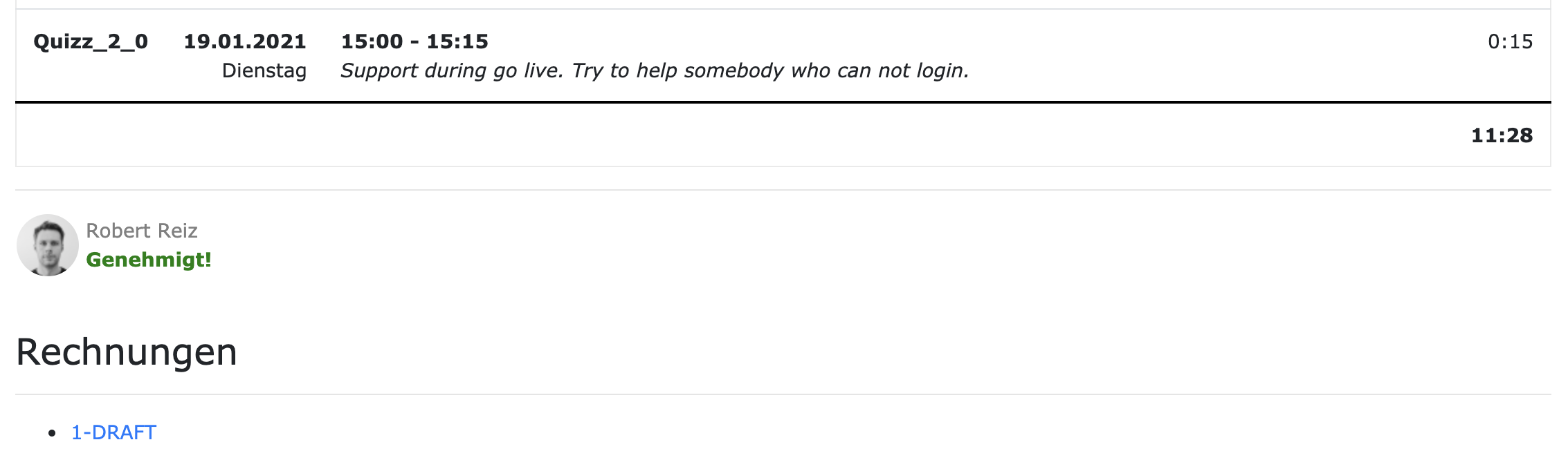 Wenn man erneut auf das Time-Sheet navigiert, dann erscheint kein "In Rechnung stellen" - Button, sondern die erzeugte Rechnung: