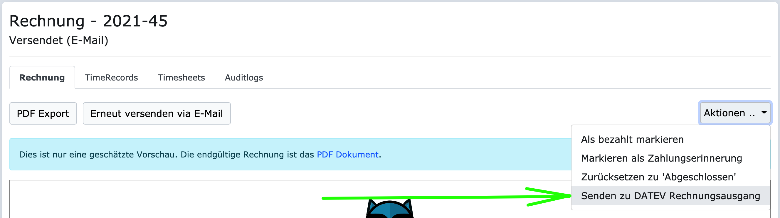 In den Auditlogs einer Rechnung können Sie auch nachvollziehen wann die Rechnung an DATEV verschickt wurde. Hier ein Beispiel: