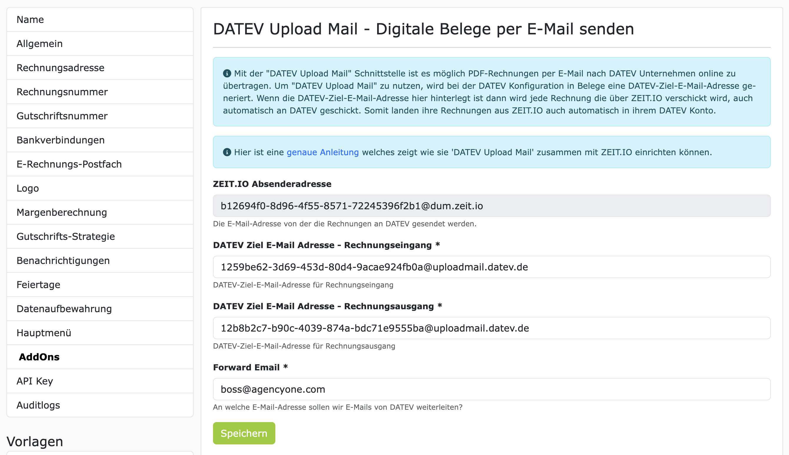 Kopieren Sie dann Zieladresse für Rechnungseingang in die Zwischenablage und navigieren Sie zu der Seite von ZEIT.IO. Tragen Sie nun die DATEV-Ziel-E-Mail-Adressen bei ZEIT.IO ein. Und wiederholen Sie das ganze für die Zieladresse für Rechnungsausgang. Wenn alle Felder ausgefüllt sind, dann klicken Sie auf "Speichern". Wenn Sie fertig sind dann sollte das ungefähr so aussehen: