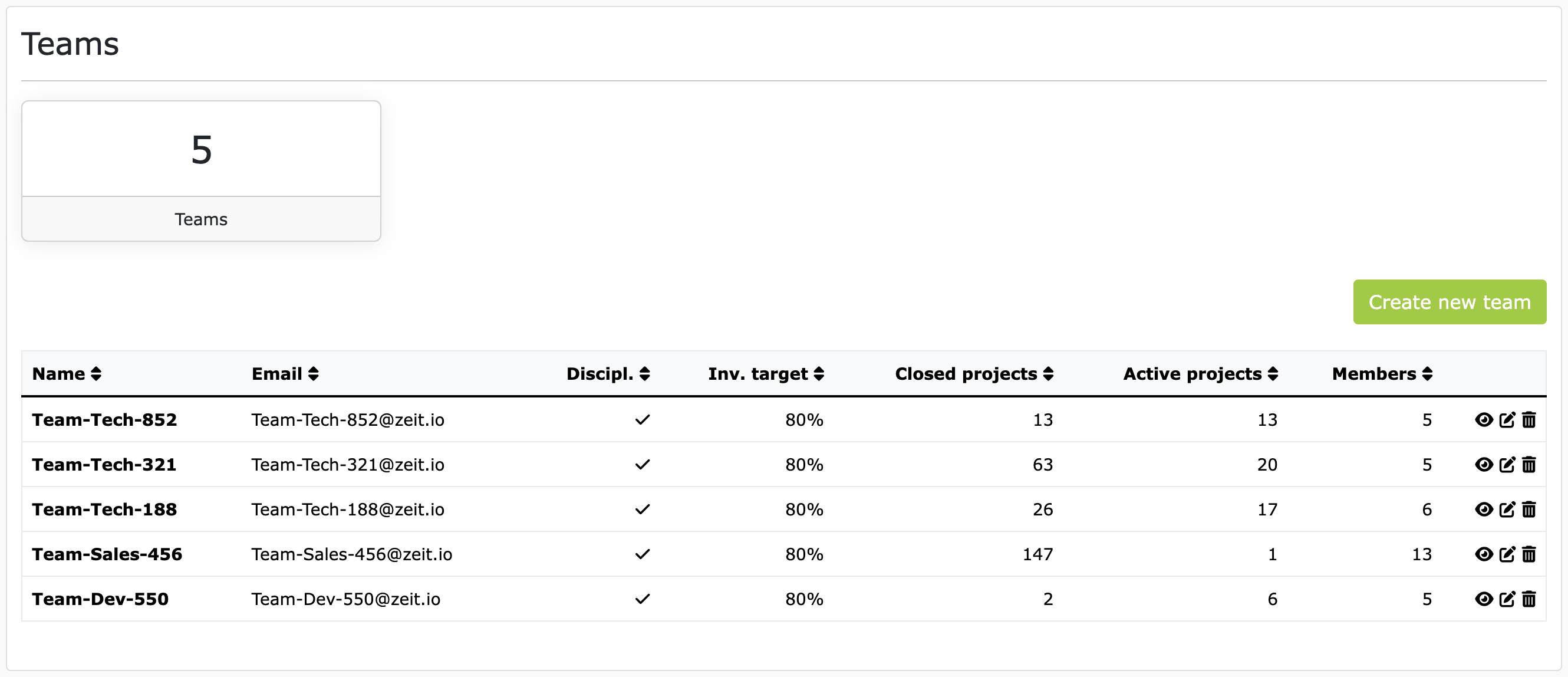 ZEIT.IO - TeamsTo create a new team, simply click the "Create New Team" button. Each team, of course, requires a name. Optionally, a team email address can also be entered. In most cases, this is a distribution list containing all team members.