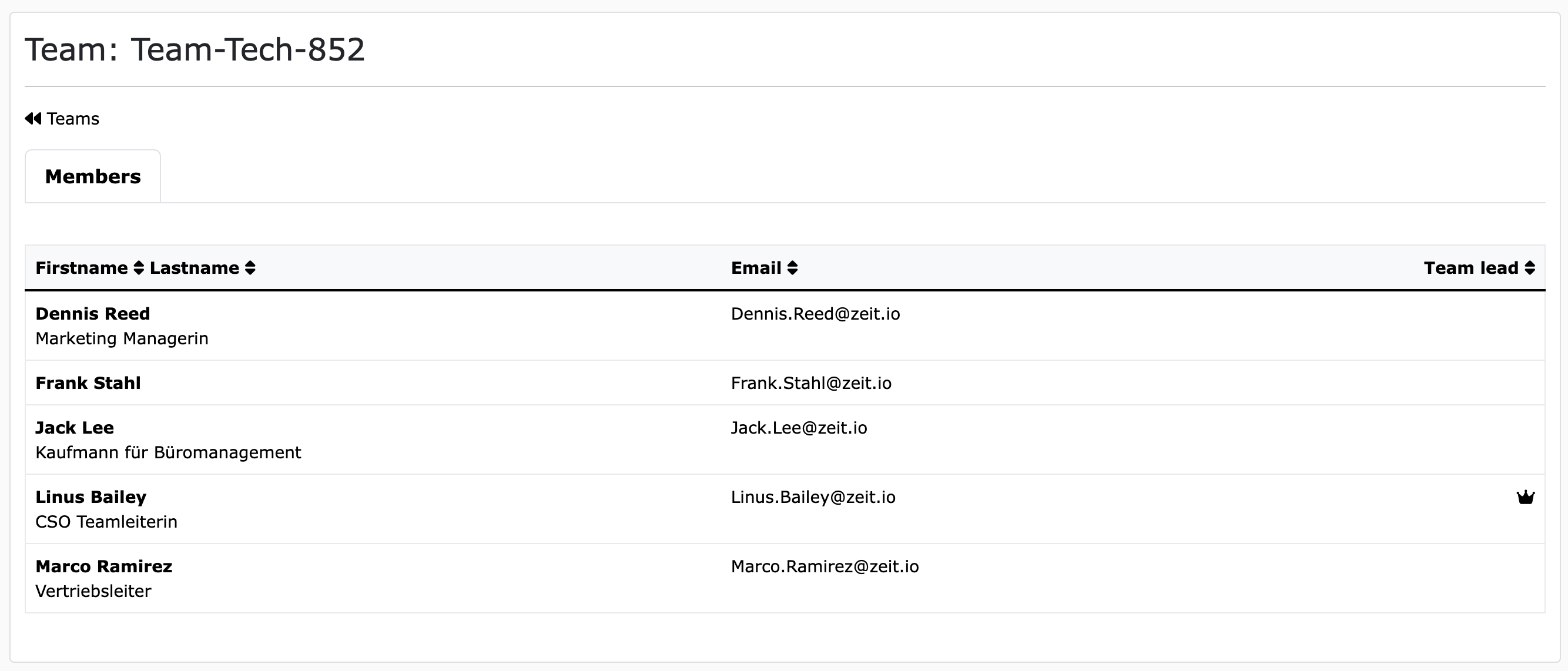 Teams for regular employees and team membersIn the detailed view, the member can see all other members and their email addresses. The team leader is also marked with a crown.