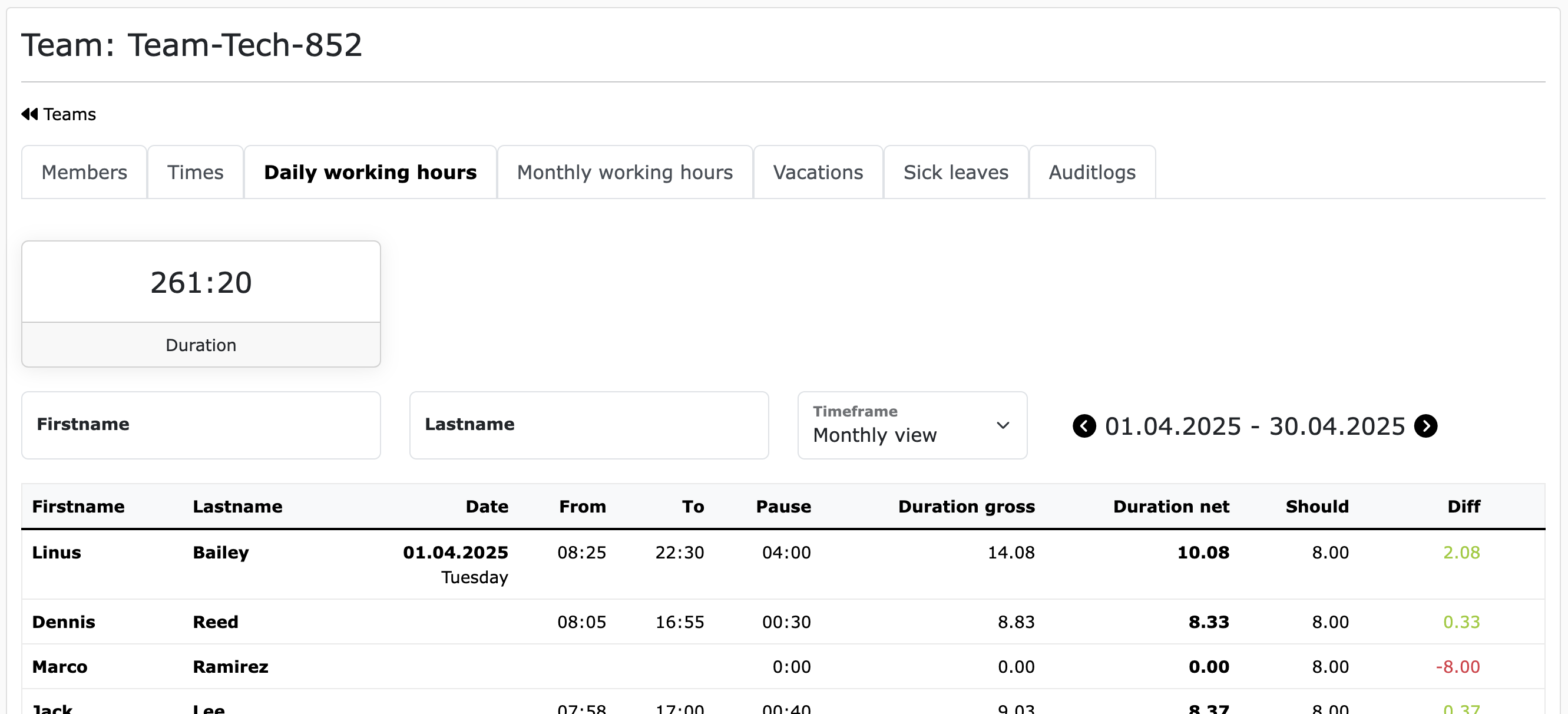 Team leaders naturally have an expanded view of the teams. Team leaders see everything that regular members see, plus they have access to the team's times, vacation, and sick notes. There are different tabs for the different views within the team details view. This is what the view of the team's booked times looks like: