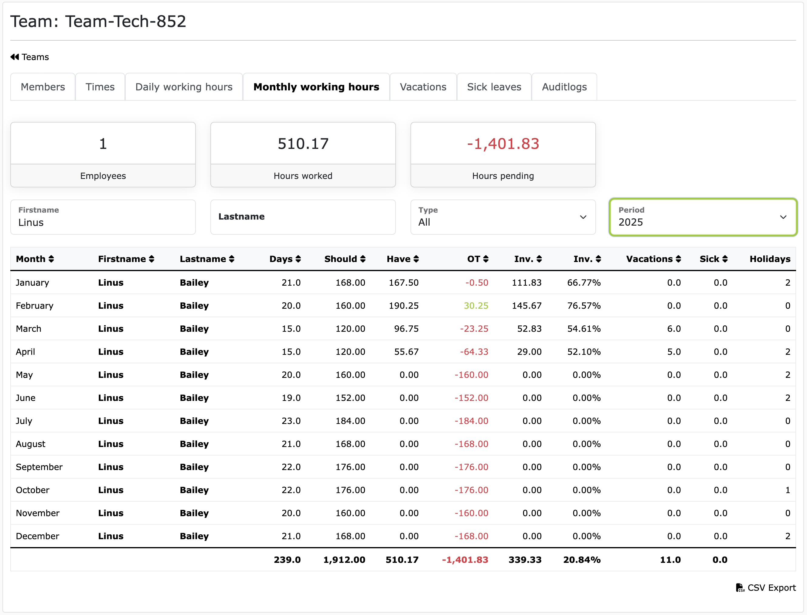Booked times of an employee accumulated monthlyThe example above shows that the selected employee's annual target working hours are 1,912 hours for 2025. This annual target working hours take into account all holidays, sick notes, and approved vacations. For better planning, it is therefore advisable for employees to submit their annual vacation requests as early as possible. The screenshot above also shows that the employee has already worked 510.17 hours in the current year and that 1,401.83 hours are still outstanding for the planned target.