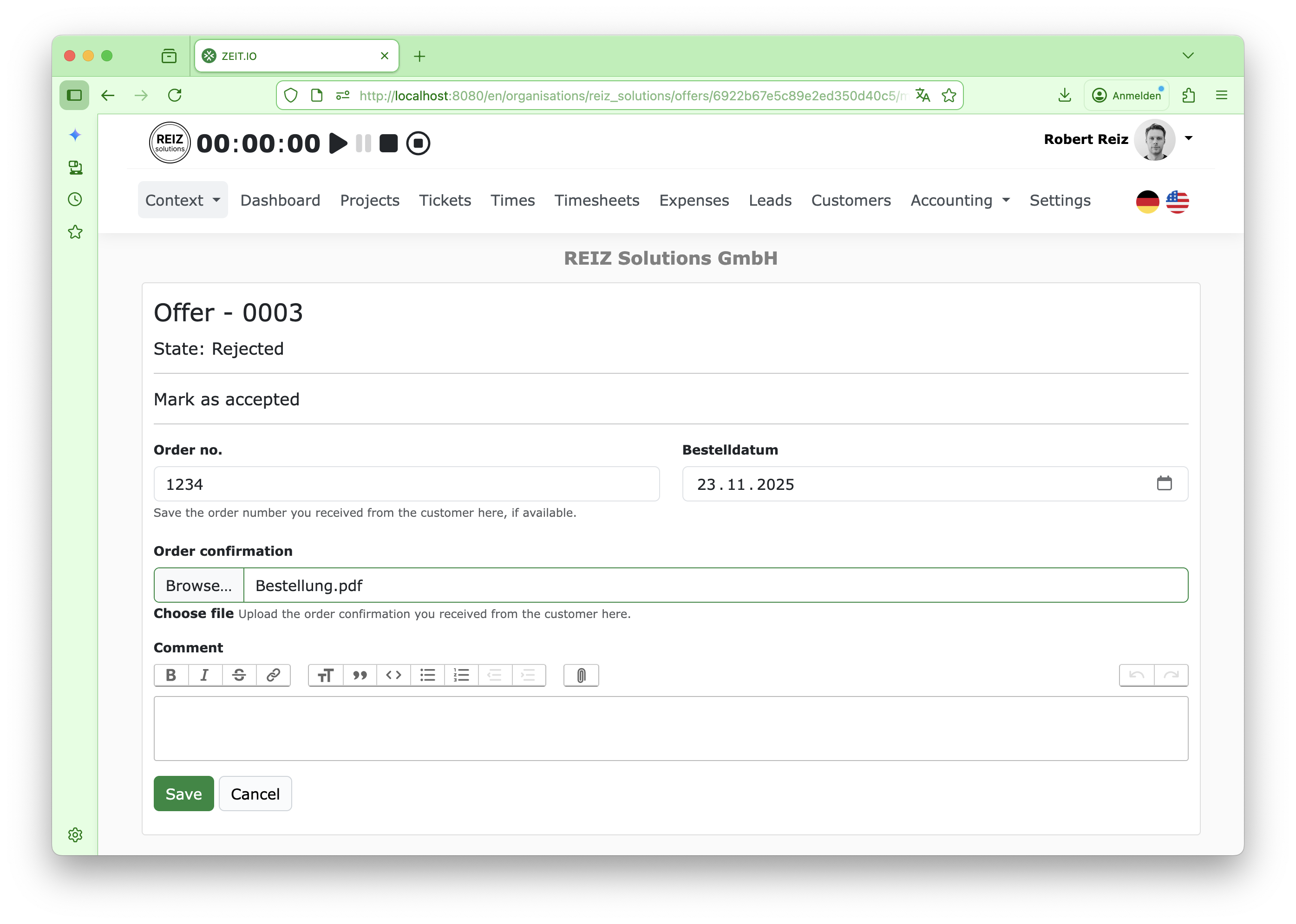 When an offer is marked as "ordered," you can enter an order number and upload an optional PDF. This optional PDF is, of course, the order confirmation you received from the customer. The form looks like this: