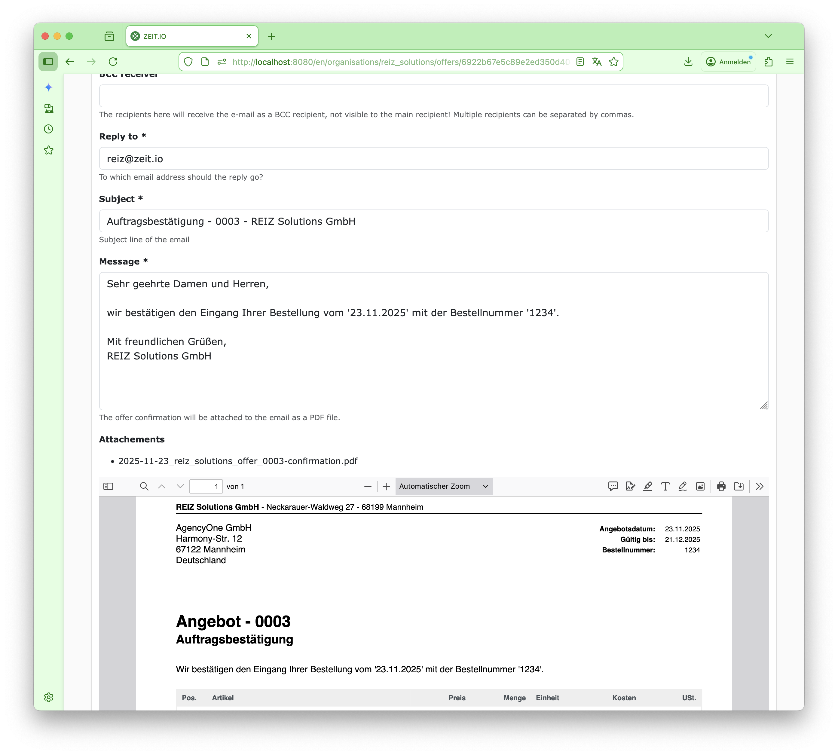 Send out the offer confirmation.The order confirmation can then be sent directly from ZEIT.IO via email.