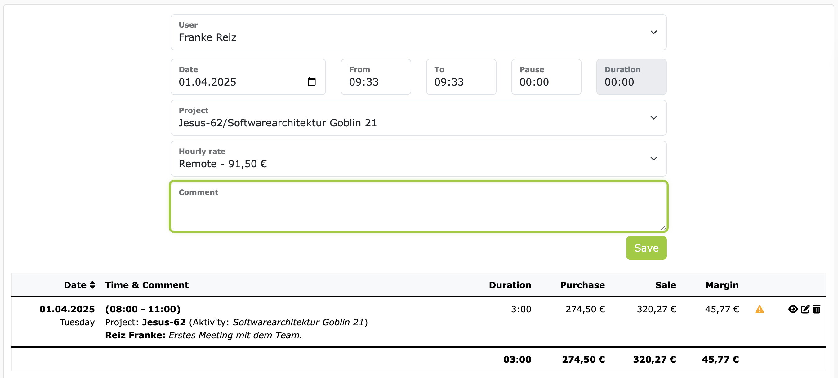 Below the input mask, all existing time records for the selected user on the selected date are displayed. Organization admins can, of course, also edit and delete existing time records. However, time records can only be edited or deleted as long as they have not been approved or invoiced. Once a time record has been approved or invoiced, the time record can no longer be edited.
